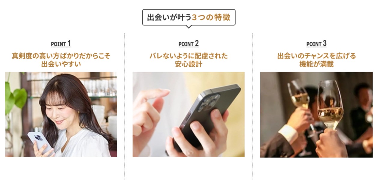 またアプリではなくブラウザ専用の設計や、気になる相手にだけ写真を公開できる機能など、周囲にバレないための配慮が徹底されています。
