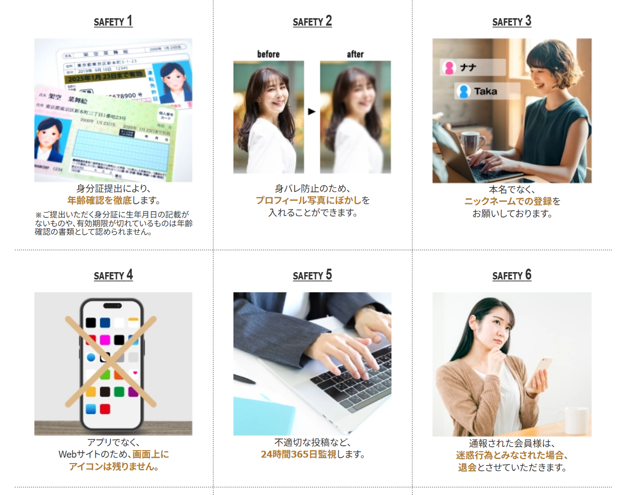 ユーザーが安心して利用できるよう、身分証による年齢確認や24時間365日の監視体制など、徹底した安全対策を導入しています。
