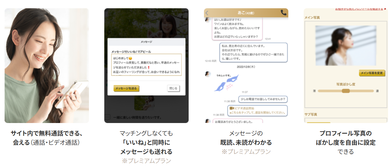 例えば、会う前にサイト内で無料通話ができる機能やマッチング前にメッセージを送れる機能*、既読確認*など、自分を効果的に印象付けられる仕組みが整っています。